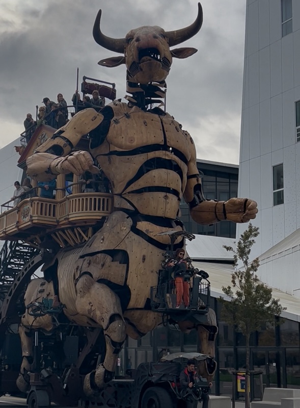 街をサイクリングしていると巨大なロボットが練り歩いていた。