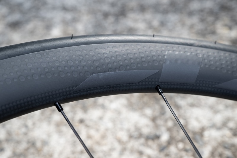 これは空力を追及したリム形状やリム表面のディンプル加工、前後とも20本という少なめのスポーク本数の相乗効果なのだろう。