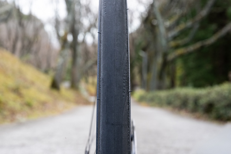 ジップのホイールに装着したときに30mm幅になるように設計されていて、見た目はかなり太く感じるが、実際に走ってみるともう少し細いタイヤのような軽快さがある。