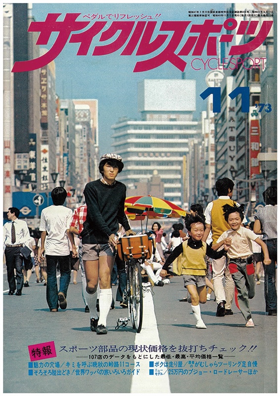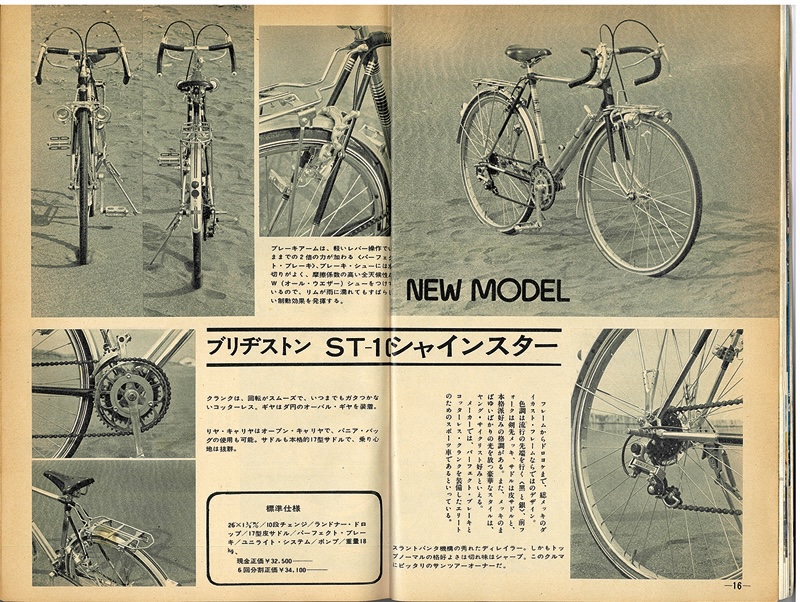 記念すべきサイスポ創刊号。色あせたページをめくり最初に目に飛び込んできたバイクは、ブリヂストン・ST10シャインスター。26インチランドナーで重量18kg、現金正価3万2500円。当時はロードレースよりもツーリング全盛であり、誌面のテイストは旅企画に寄ったものに。いよいよ日本のロードバイク文化は花開いていく。