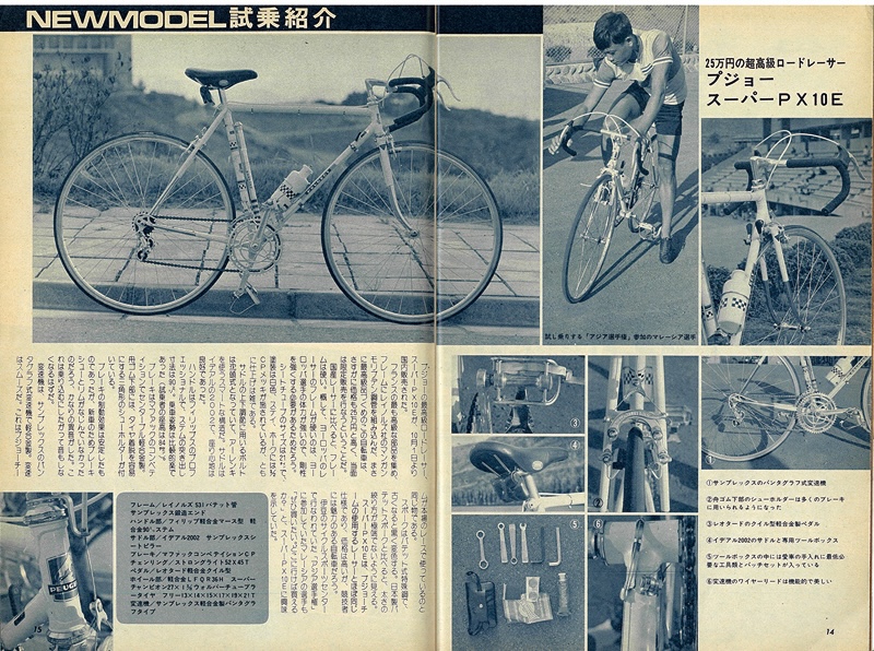 ニューモデル特集として掲載されていたのはプジョー・PX10E。レイノルズ531バテッド管、マファックのブレーキ、サンプレックスの変速機と当時の“ロードレーサー”の最先端。誌面のテイストは変わらずツーリング色が強く、峠走や旅行記から当時の道路事情がうかがい知れる。カラーは最初の8ページのみで、残りはモノクロ。