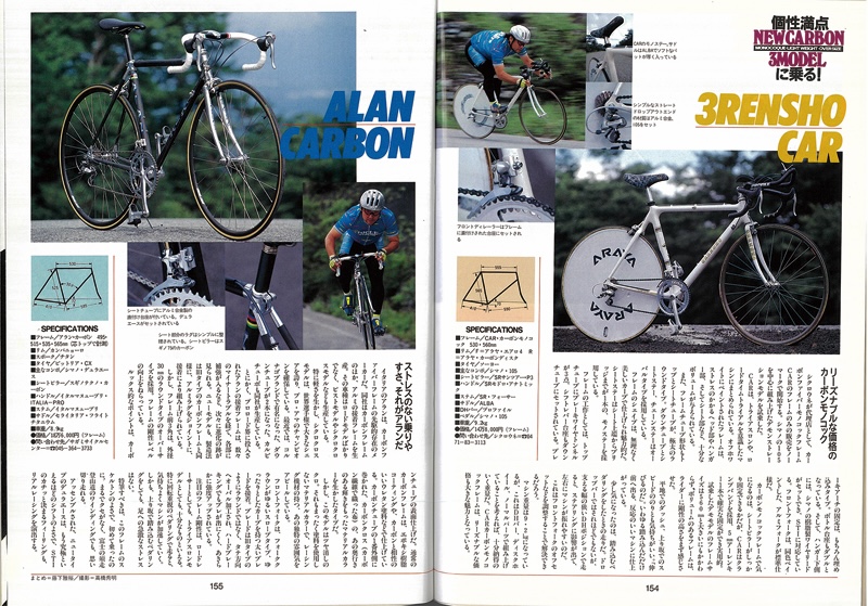 カーボンバイクの3モデルインプレッションが掲載。アラン・カーボンはカーボンチューブをつないだアルミ製ラグドフレームで、見た目はクロモリバイクのように細身で美しい。同インプレ記事ではデュラエースのSTIレバーが絶賛され、ダブルレバーからの移行期を思わせる。MTBとトライアスロンの特集ページが目立ち始め、次第にスポーツ色の強い誌面に。