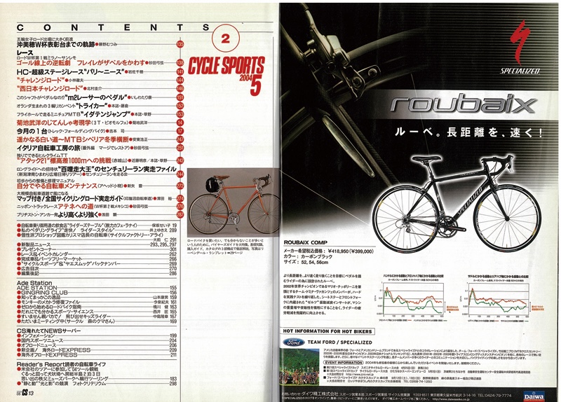 エンデュランスロードの始祖と言うべき名車、スペシャライズド・ルーベが登場。ロードレーサーへのカウンターという立ち位置は画期的であった。メイン企画は「一から始めるロードバイク大全」。カーボン、アルミ、チタン、ハイブリッド、スチールの5系統が等しく共演する豪華な世代だ。総予算20万円で全てそろう羨ましい時代でもあった。