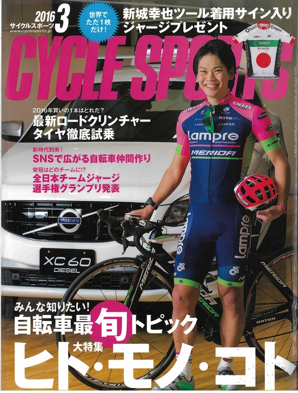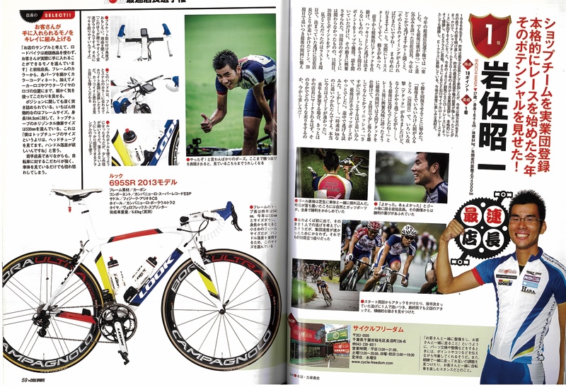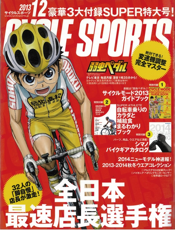 2008年連載開始、2013年にアニメ化を果たした弱虫ペダルが表紙を飾った号。サイクルモードのガイドブック、シマノのカタログが付録となった超特大号であり、第3回全国店長最速選手権が目玉企画に。優勝者であるサイクルフリーダム岩佐店長の愛車はルック・695SR。スーパーレコードEPSにボーラウルトラ2で武装したレースマシンだ。