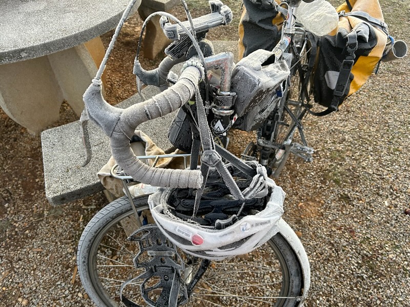雪は降らないのだが、全てが凍っていた。自転車やテント、飲料水はもちろん、自分の髪の毛が凍っていたことには驚いた。