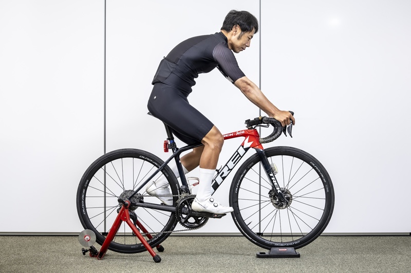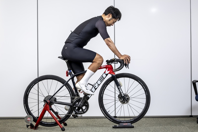 フォームを維持しながら、ペダリング中に脚がカクカクしないよう、ゆっくり丁寧に回すことが重要だ。上死点付近ではペットボトルを前に倒すような脚の動きを意識し、3時の位置までペダルの真上から体重を乗せる。引き脚局面では荷重をしっかり抜き、アンクリングしないこともポイントとなる。