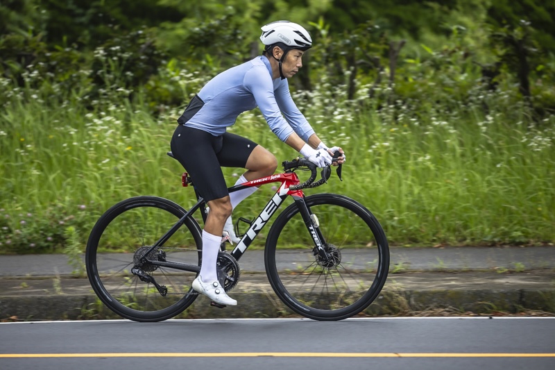 そこで、ペダルに体重が乗せやすい、サドルの適正位置に腰を据えたフォームが重要となる。このとき、骨盤が前傾しへそが斜め下を向いているのが分かる。肩まわりもリラックスしているため、肩甲骨を動かして上半身の力を生かしたペダリングがしやすい。また、上死点から3時の位置までしっかり真上からペダルに体重を乗せられるので、力強いペダリングができる。