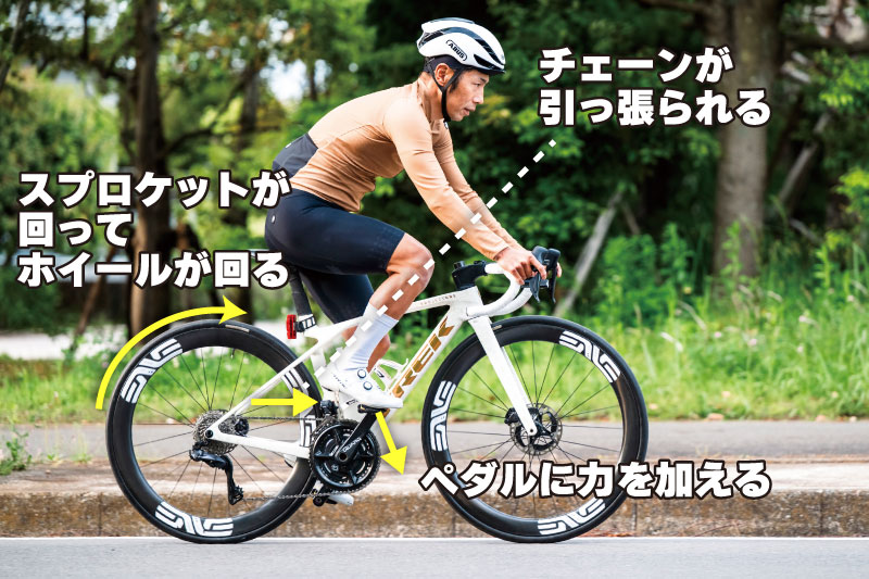 ペダリングとは、ペダルに力を加えてクランクを回し、チェーンを介して後輪を回転させることで推進力を生み出す動作です。