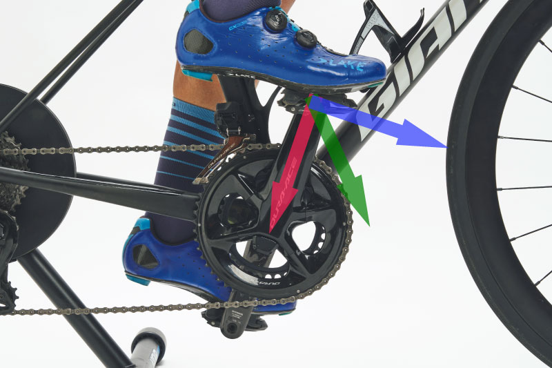 重要なのは、力を加える方向です。クランクを回転させるためには、クランクと直角に交わる「接線方向」に力を加えるのが最も効率的で、それ以外の方向の力は推進力に変わりにくいとされています。