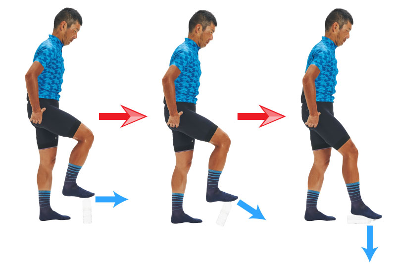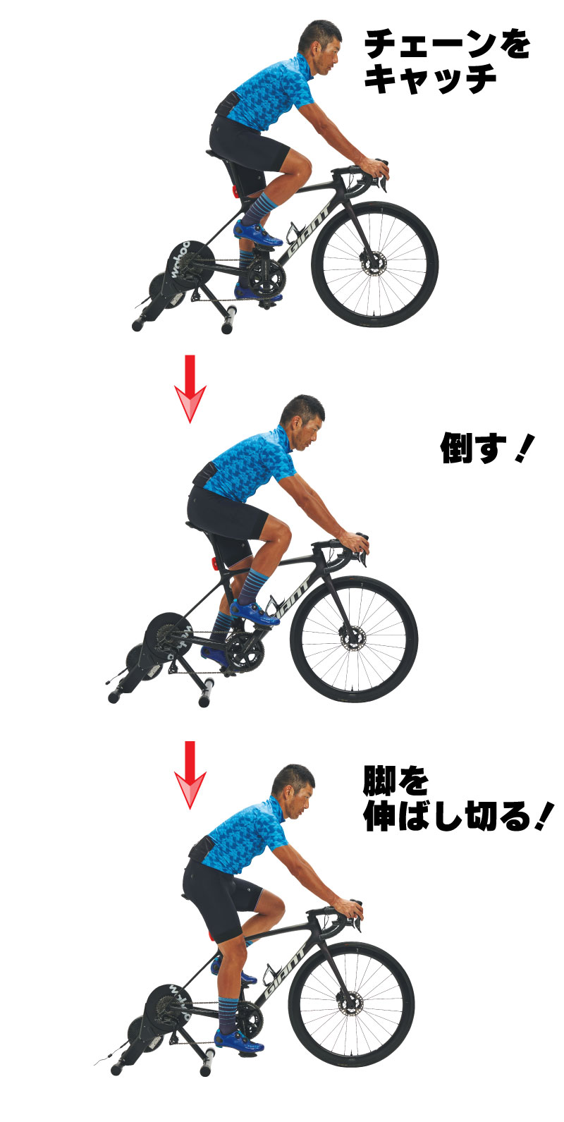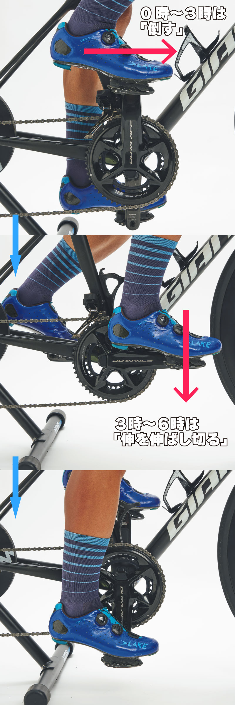 上死点と下死点の位置を把握し、0時から6時までの脚の動きを確認します。片脚を上死点の位置に持ってきて静止し、その後フリーハブの音をさせないようにペダルを踏み始めます。反対脚が上死点に来た時点で再び静止し、同様にフリーハブの音をさせないように踏み始める動作を繰り返します。腿でペダルを踏まず、踵を下げないようにします。0時からペットボトルを倒すように脚を動かし、スクワットの要領で脚を伸ばします。