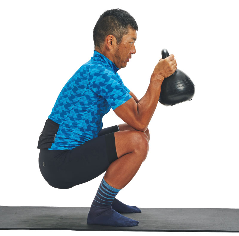 背中を真っすぐに保ったままスクワットします。脇を締めてケトルベルを持つと、使いたい筋肉を意識しやすくなります。腿に力を入れず、腹圧を高めて腹筋を意識し、お尻まわりの筋肉を使って腰を沈めます。腿が床と平行よりも沈み込んでから、ゆっくり立ち上がります。これを30回ほど繰り返します。