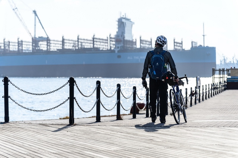 街の中心地から外れて造船所のある辺りを目指す。小高い丘を上ったところでペダルを止める。道路を渡ったところで、造船所を上から眺めるためだ。