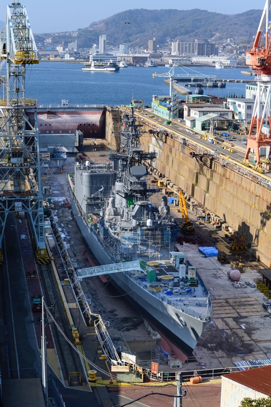 眼下には広大なドック。海上自衛隊の艦船だろうか。メンテナンスなのだろう、バトルシップグレーの船体がドックの中に横たわっている。