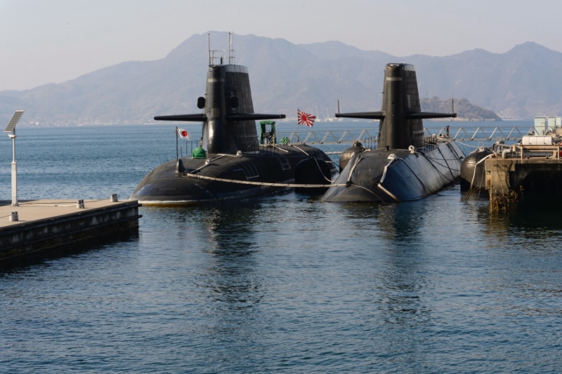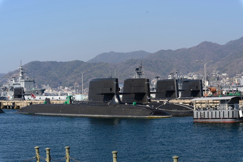 「アレイからすこじま」公園にある海上自衛隊基地の桟橋に到着した。驚いたことに数多くの潜水艦が係留されている。