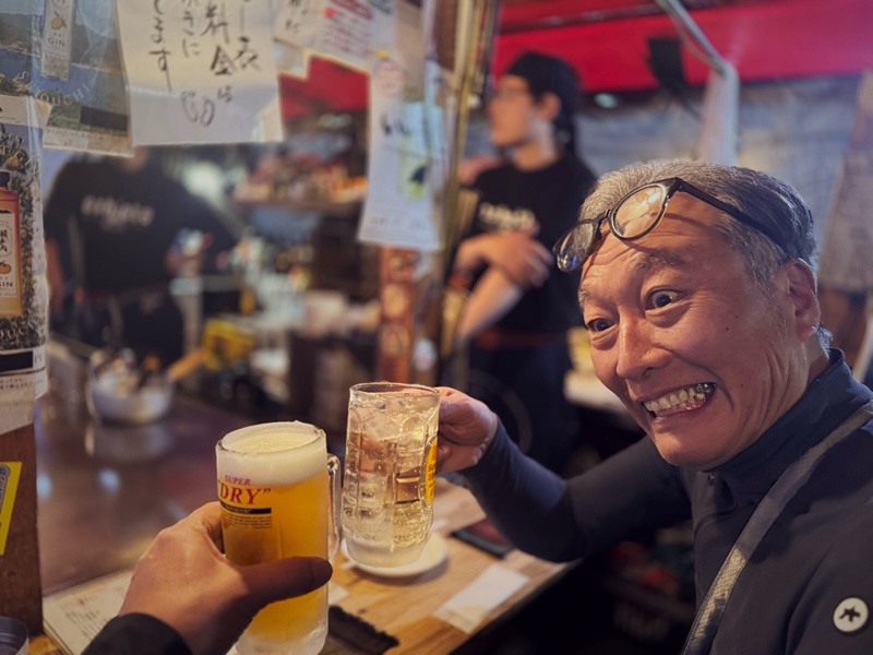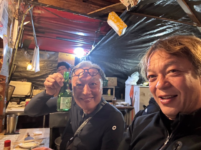 ではここでしか食べられないものを、と薦められるままに注文していく。すると料理がテンポ良く出てくる。熱々の鉄板料理。地元食材。香ばしい湯気。これが本当にうまい。味だけではない。スタッフの軽妙なトーク、料理が運ばれてくるリズム、店内の他のお客さんとの距離感。屋台という空間そのものが“味”なのだろう。いつものようにハイボールが進み、気分がほぐれたところでシシャチョーが切り出す。「実は自転車メディアの取材で……」と申し込んでみる。
