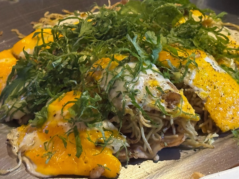 地元の食材を使ったこの屋台オリジナルの豚の胃袋一夜干し、呉餃子、ネギ紅しょうが焼き、がんすなどをピカピカの鉄板で仕上げてくれる。※がんす(呉のソウルフード、魚のすり身に玉ねぎや唐辛子を混ぜてパン粉をまぶし揚げた、ピリ辛で旨味のある揚げかまぼこ)