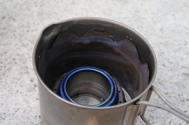 ストーブ内側には30mlと60mlの目盛りがあり、30mlのアルコールで約5分燃焼、400mlの湯沸かしが可能だ。