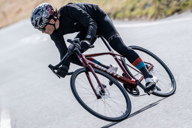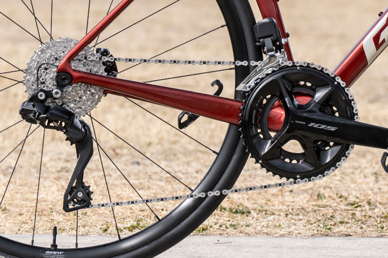 KOMの名の由来であるワイド&ローレシオのギヤ設定も、実際に走らせてみるとその恩恵は明確だ。最軽ギヤは34×36Tであり、10%を超えるきつい勾配でも過度に構える必要はなく、一定のリズムを保ったまま上り続けることができる。さらにシマノ・105 Di2の存在も大きく、ペダルにトルクをかけた状態でも躊躇なく変速できるその正確性は、ヒルクライムやレースシーンにおいて確実な武器となるはずだ。