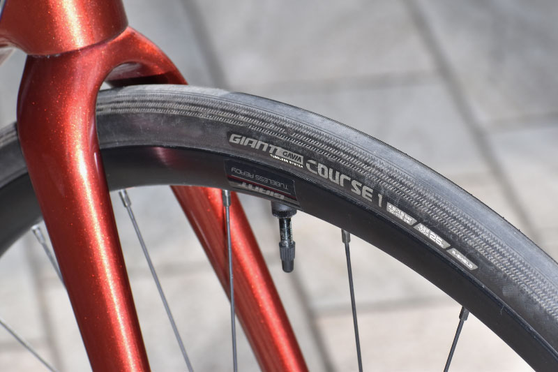 前後とも36mmハイトのアルミリムに、タイヤはジャイアントのガヴィア コース1(25C)を組み合わせる