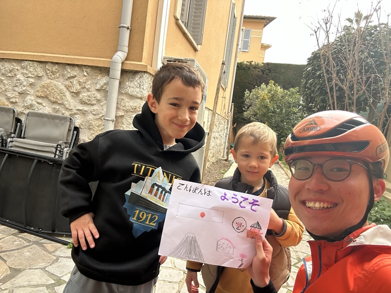 ニースではホスト宅に自転車を預け、市内の美術館巡りを楽しむ。シャガール美術館は偶然入場無料で、ゆっくりと作品を堪能できた。帰宅すると日本語で書かれた歓迎ポスターが。「こんばんは、ようこそ」と書かれた文字はホストファミリーの子供たちが学校から帰ってきた後に用意してくれたのだという。異国の地でも歓迎される喜びを感じた。
