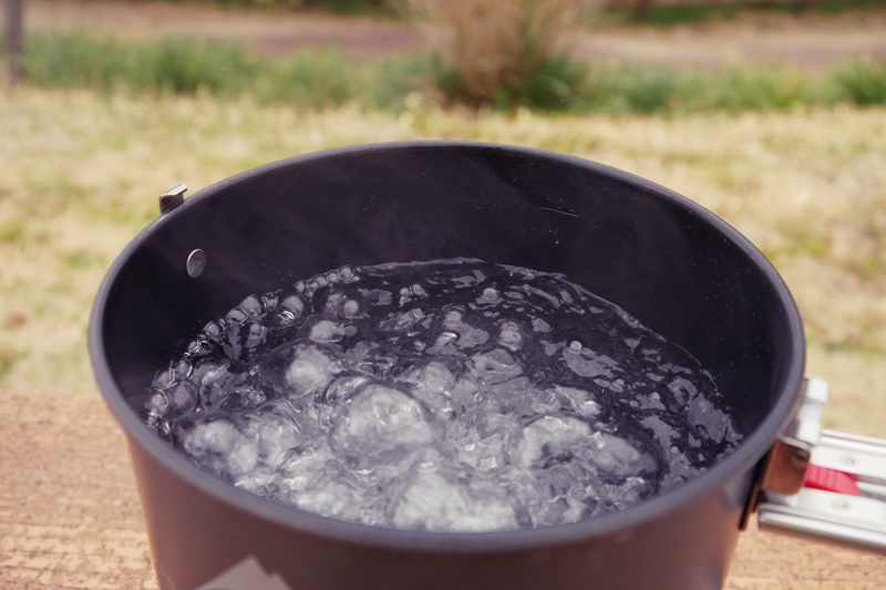 インスタントラーメンをつくるのに必要な水は、約500ml。だとすると、クッカーの容量は700~800ml程度あれば十分だろうと思うでしょう。でも、実際はそうじゃないんだ。