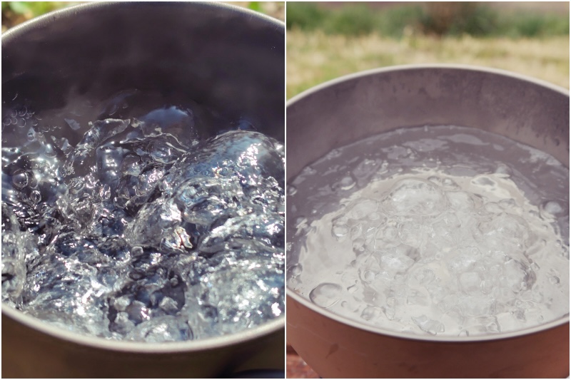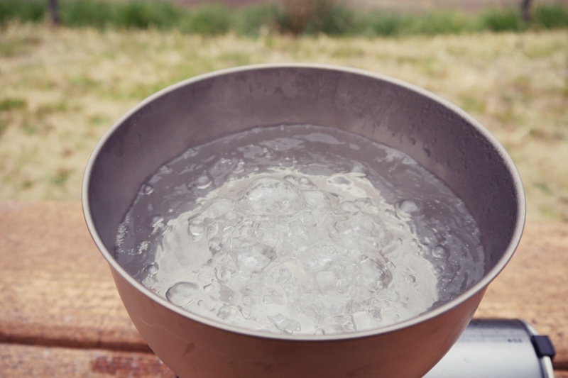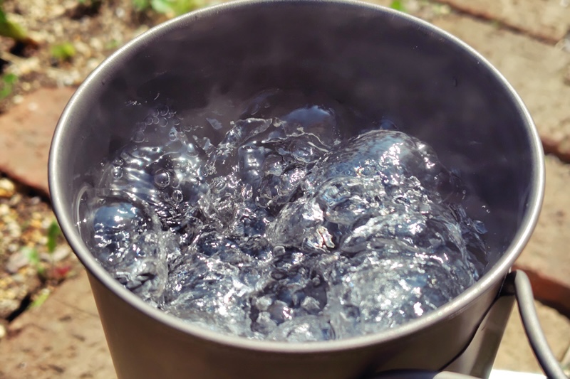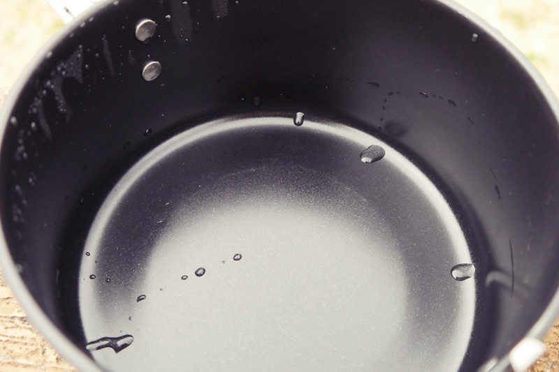さらにMSR以外は、すべてチタン製。アルミは熱伝導率が高いので、ほぼ同じサイズのSOTOよりもMSRの方が、沸騰時間が短い。上画像は左がMSR、右がSOTOだけれども、MSRは鍋底全体から沸騰時の泡が出ているけれど、SOTOは中心部から泡が出ているのが、熱伝導率の違いを表している。