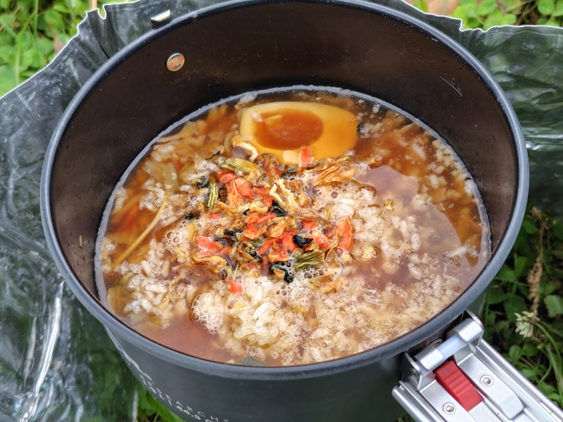 という、考えから生まれたのが、上画像の、ラーメンスープ雑炊。あまりがちなラーメンスープに、フリーズドライの白米を投入。フリーズドライの白米は、お湯で戻すのが通常だけれども、ラーメンスープに入れて、ストーブで炊けば、短時間でできあがる。その白米も、売られているままのパッケージで持って行くのではなく、自転車キャンプの行程に合わせてジップロック袋等に移し替えておいて、食事ごとに必要分を戻せば、無駄がない。