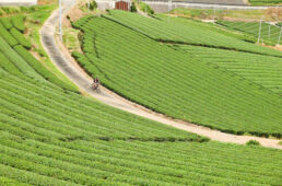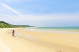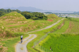 ⑥筑後平野の水田風景 福岡県の穀倉地帯である筑後平野は、夏の季節に水田の緑が鮮やか。水田の中を走る小道にお邪魔して、緑の中を走る快感も味わいたいところ。クリーク広がる水路沿いも爽快です。