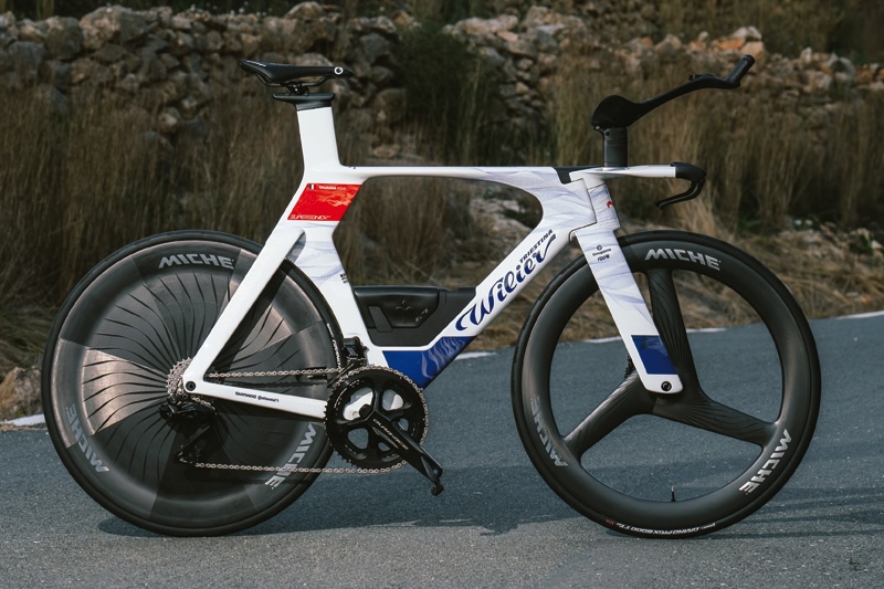 昨年からイタリアンブランドのウィリエールトリエスティーナを駆るグルパマ。エアロ系万能機の「フィランテSLR」の使用頻度は高いものの、グランツールでの総合上位が期待されるD・ゴデュが山岳ステージで勝負をかける際に頼りにするのは、ニューモデルの「ヴェルティカーレSLR」だ。軽量系万能機というコンセプトは前作のゼロSLRから継承するものの、フレーム形状は再設計され、カーボン素材も見直された。さらに「アクティブモールディングシステム」というフレームの製造も新たに採用。形状・素材・製法の全てを最新・最適化してフレーム単体で720g(Mサイズ塗装済み)の重量を実現した。もちろん高い重量比剛性を得ながらも空力性能へも配慮は抜かりなく、今回は新たにステム一体型のフレア形状ハンドル「Vバー」もセット。そして、昨年までシマノのホイールを装備していたが、今年はウィリエールの傘下にあるイタリアンパーツブランド、ミケのクレオスRDに変更。これにより、完成車としての総合力がさらに磨かれた。