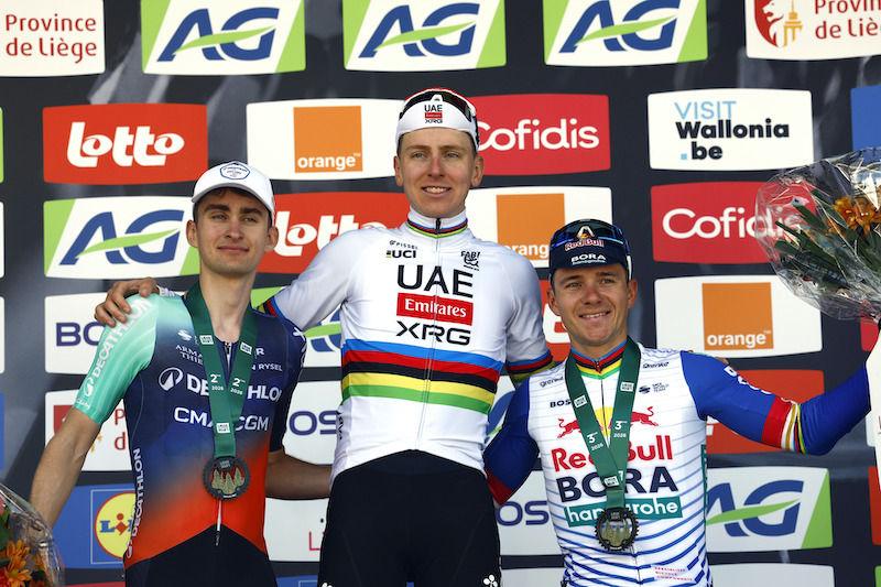 リエージュ~バストーニュ~リエージュ2026の表彰台。左から2位のセクサス、3連覇したポガチャル、3位のエヴェネプール (photo : ©Sprint Cycling Agency) 2026.04.27 リエージュ~バストーニュ~リエージュ2026の... このフォトが使われている記事へ > ツイート シェア 関連フォト