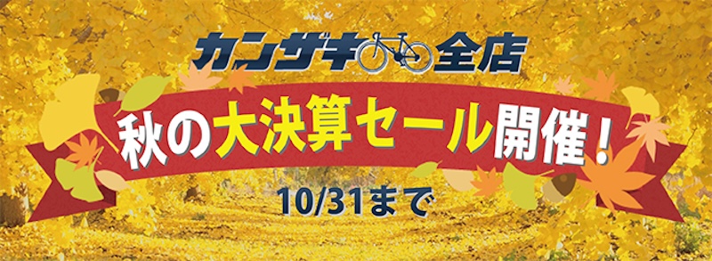 サイクルショップカンザキ各店では、9/26~10/31の期間、決算セールを開催します。