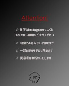 ロードバイク(※)、クロスバイク、その他バイクの3カテゴリーそれぞれ先着5名・計15名のみが20%オフで購入できるというセール。購入の際はバイシクルランドサカタニのX、もしくはInstagramのアカウントをフォローして、フォロー画面の掲示が必要だ。