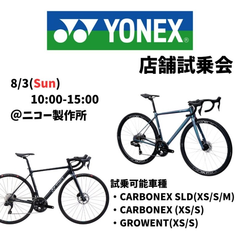 愛知県名古屋市のサイクルショップ、ニコー製作所で、2025年8月3日(日)、「YONEX(ヨネックス)試乗会」が開催される。「カーボネックスSLD」「カーボネックス」「グローエント」の3車種のロードバイクを体感できるほか、2025年9月下旬発売予定のカーボネックスSLDの新色も見ることができる 。
