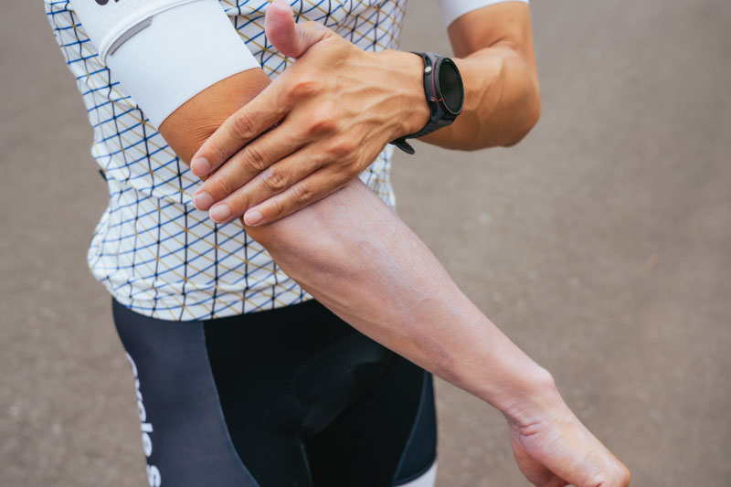 好みにもよりますが、UV対策用の速乾性に優れた涼しいタイプのアームカバー&レッグカバーを着用し、直射日光が肌に当たるのを防ぐと効果的です。さらに、この部分にどんどん水をかけていき気化熱で体を冷やしながら走るのも良い手段です」。
