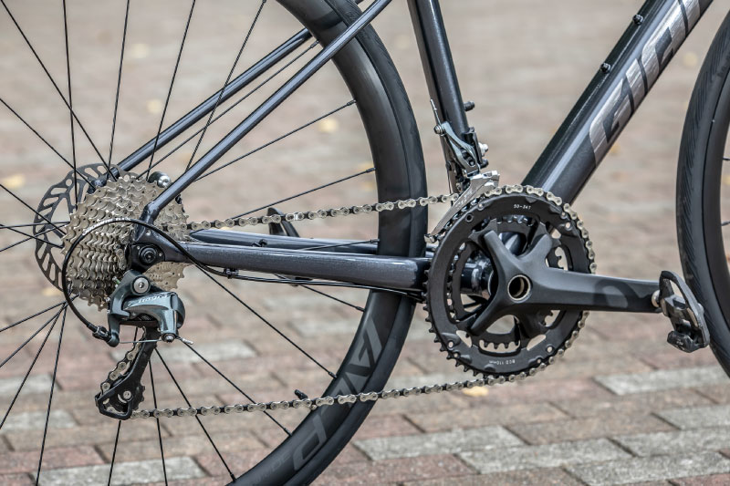 主要コンポはシマノ・ティアグラ。ギヤは前2枚×後10枚の20段変速だ。最も軽いギヤ比は1:1の仕様なので、急勾配の上りや長距離のヒルクライムでも無理を強いられない
