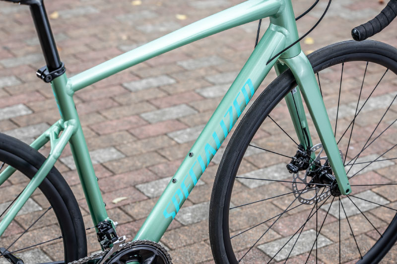 スペシャライズド・アレー コンプ ●価格:24万7500円 ●メインコンポーネント:シマノ・105(2×12速) ●サイズ:44、49、52、54、56、58、61(試乗車サイズは54) ●カラー:3種類(試乗車のカラーはオアシスティントオーバーシルバーダスト/ラグーンブルー) ●試乗車実測重量:9.24kg(54サイズ)