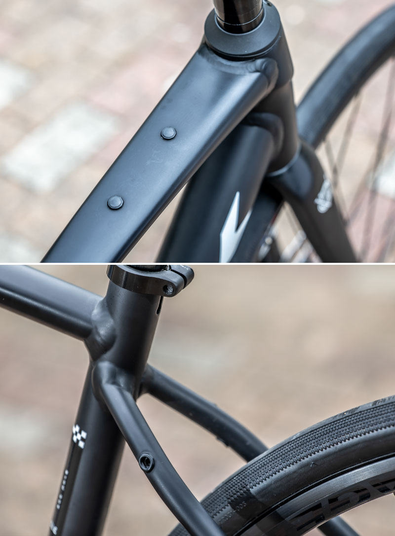 トップチューブの上面には小型のフレームバッグを直接装備できる台座がある。ライド時の補給食やスマホなど、すぐに取り出したい携行品を入れておくのにとても便利だ。快適性を高めるためにシートステーは細身だ。最大38mmのタイヤを履けるようにフレームのクリアランスは大きめで、ラック類を装備できる台座もしっかりと装備する