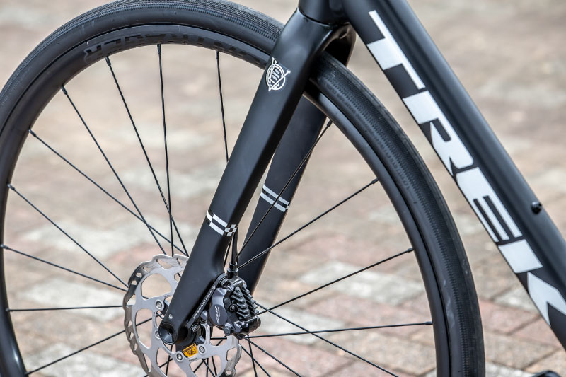 フロントフォークは軽量化と乗り心地を高めるためにコラムまでカーボン製。ディスクブレーキの台座部分は断面積の大きな設計で、確実なブレーキコントロールに貢献する