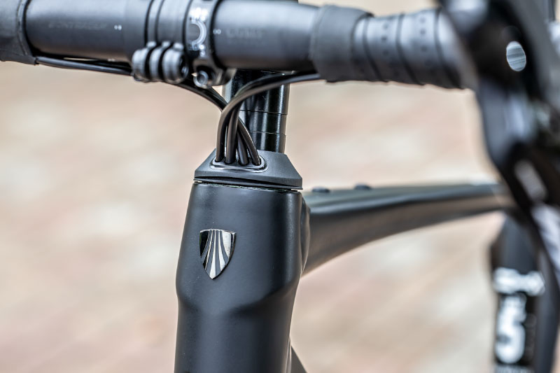 ケーブル類はヘッドパーツのトップキャップの部分からフレーム内に収納され、すっきりとした外観を実現している。ヘッドマークがバッジタイプなのも高級感を演出する