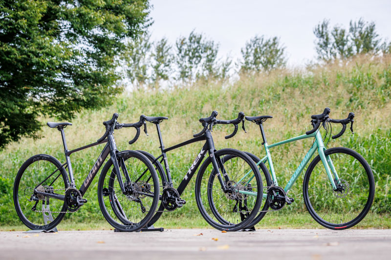 バイク選びのもう一つの重要な要素となるコンポに目を向けると、シマノのロードコンポでサードグレードとなるリヤ12段変速の105の機械式モデル、もしくはその下に位置するリヤ10段変速のティアグラを搭載する車体が中心となる。そしてディスクブレーキも上位モデルと同じく、操作性と制動の安定性に優れる油圧式が主流だ。今回は、そんな仕様で構成されるメジャーブランドの3モデルを試乗して、最新エントリーグレードの現在地を確かめる。