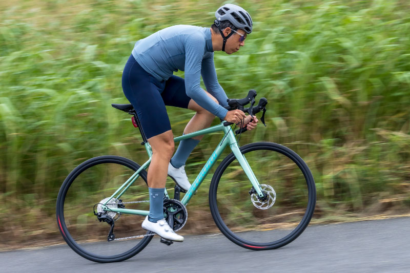 吉本:安定感は抜群ですね。車重もエントリーモデルなので軽くありませんが、それを感じさせない滑らかな走りがあります。レースバイクじゃないので加速が際立つことはないけれど、等速で走り続けるには慣性が効いて、流れるような走りが気持ち良いですよ。サイクリングを楽しむにはとてもいい一台ですね。
