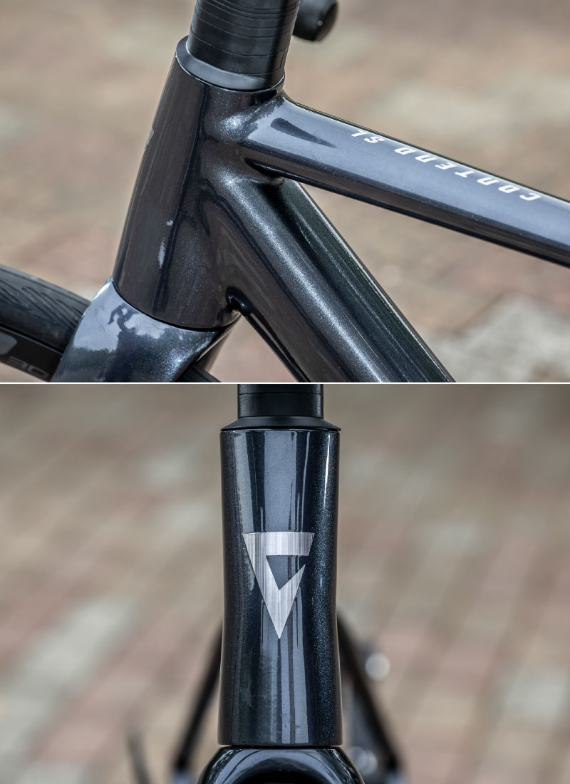 写真上:チューブの接合部には、一般的なTig溶接で存在するビードと呼ばれる溶接痕がない。美しい造形はカーボンフレームと見まごうほどだ。写真下:ヘッドチューブは中央部にくびれがある。プロペルから受け継ぐエアロ形状だ。