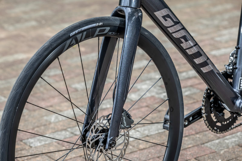 フロントフォークは、ブレード部だけでなくステアリングコラムもカーボン製として、軽さをより推進させる。タイヤは30Cを標準装備。バイク操作の安定性と乗り心地を高める