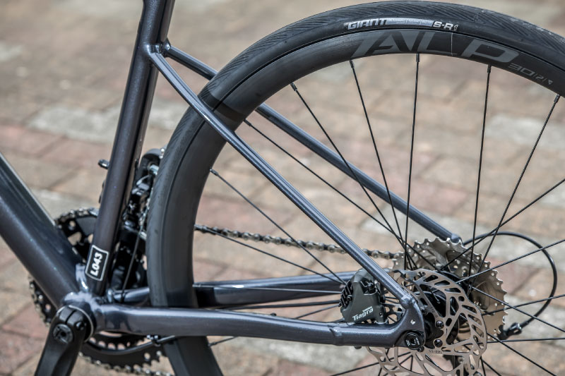 左右のシートステーを斜めにまたぐように配置される特徴的なシートステーブリッジ。バックステーの剛性を最適化する。ディスクブレーキは安定した制動を発揮する油圧式