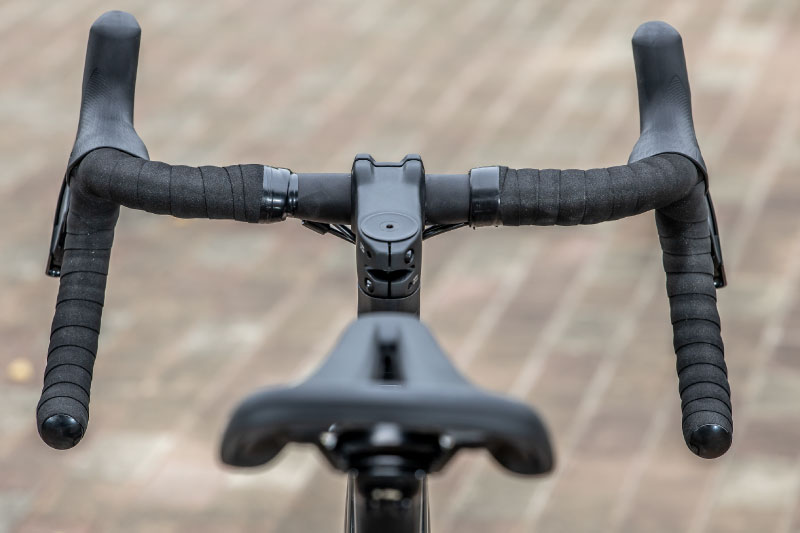 ハンドルは下側が広がるフレア形状と呼ばれるタイプを搭載。ブレーキブラケット部分を握るとエアロ効果が得られ、下側を握ると下りや悪路におけるバイク操作性が安定する