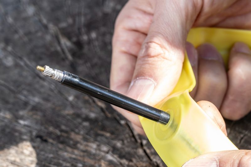 バルブ本体は樹脂製で金属製のコアは取り外しができないタイプ。チューブとの接合は無駄なくきれいに行われている。チューブ同士継ぎ目は、一般的なTPUチューブのよりも接合部の重なりが少ない(7~8mm程度)